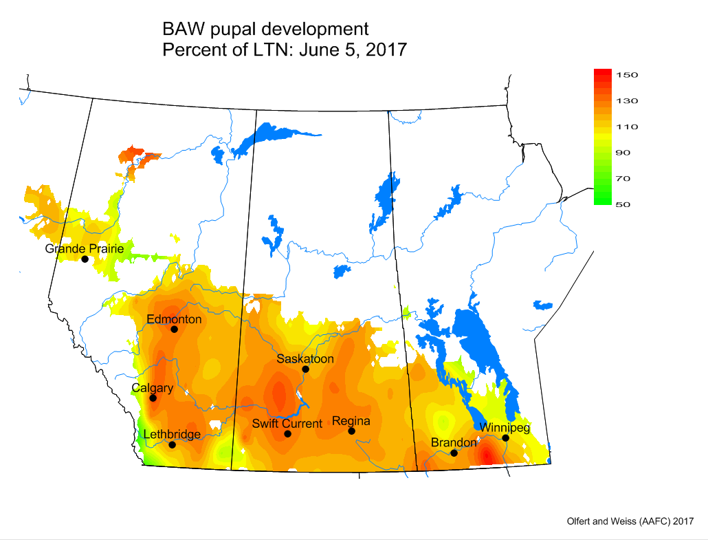 The second map indicates that development, compared to long-term-average, is slightly greater than average development. Model output indicted that first adult emergence may occur this week in the Vauxhall, Brooks and Regina areas.